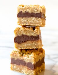 Instructions Preheat the oven to 350 degrees F. Line a 9x13-inch baking dish with parchment paper. Place the oats in a food processor and pulse to partially grind. Place the brown sugar, butter, and vanilla extract in an electric stand mixer. Beat on high to cream the butter and sugar until light and fluffy, about 3-5 minutes. Turn the mixer on low and add the eggs, baking powder, salt, and cinnamon. Then slowly add the flour and ground oats. Scrape the bowl, then beat again until smooth. Scoop 60% of the dough into the baking dish. Spread the mixer evenly over the pan. For the fudge layer, place the sweetened condensed milk, chocolate chips, and butter in a microwave safe bowl. Microwave for 2-3 minutes, until the mixture is warm enough to melt the chocolate. Stir until smooth and pour the fudge over the bottom oatmeal layer. With the remaining oatmeal dough, drop small pieces over the entire surface for the fudge. Bake for 30-35 minutes, until golden on top. Cool completely before cutting. (Chill for 60 minutes for the cut pieces.)